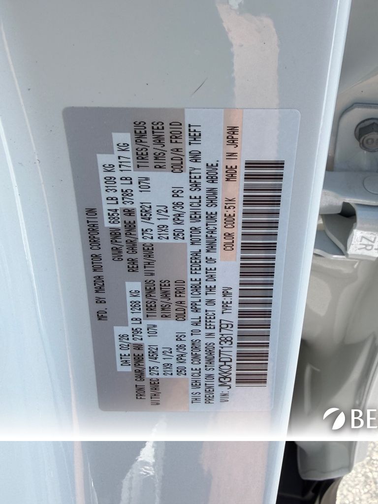 Serving The Valley For Over 40 Years! This Mazda CX-90 is equipped with the following features: 12 Speakers, 2nd-Row Captain's Chairs, 3rd row seats: bench, 4-Wheel Disc Brakes, ABS brakes, Air Conditioning, Alloy wheels, AM/FM radio: SiriusXM, Auto High-beam Headlights, Auto-dimming door mirrors, Auto-dimming Rear-View mirror, Automatic temperature control, Black Liftgate Garnish, Black Lug Nuts and Black Wheel Locks, Brake assist, Bumpers: body-color, Compass, Delay-off headlights, Driver door bin, Driver vanity mirror, Dual front impact airbags, Dual front side impact airbags, E911 Automatic Emergency Notification, Electronic Stability Control, Emergency communication system: MAZDA CONNECT, Exterior Parking Camera Rear, Four wheel independent suspension, Front anti-roll bar, Front Bucket Seats, Front Center Armrest w/Storage, Front dual zone A/C, Front reading lights, Fully automatic headlights, Garage door transmitter: HomeLink, Heads-Up Display, Heated door mirrors, Heated front seats, Heated rear seats, Heated steering wheel, Heated/Ventilated Front Bucket Seats, Illuminated entry, Infotainment System Voice Command, Knee airbag, Leather Seat Trim, Leather Shift Knob, Leather steering wheel, Low tire pressure warning, Mazda Connected Services, Mazda Online Navigation, Memory seat, Navigation system: MAZDA CONNECT, Occupant sensing airbag, Outside temperature display, Overhead airbag, Overhead console, Panic alarm, Passenger door bin, Passenger vanity mirror, Power door mirrors, Power driver seat, Power Liftgate, Power moonroof, Power passenger seat, Power steering, Power windows, Radio Broadcast Data System Program Information, Radio data system, Radio: : AM/FM w/HD/Bose 12-Speaker Sound System, Rain sensing wipers, Rear air conditioning, Rear anti-roll bar, Rear reading lights, Rear seat center armrest, Rear window defroster, Rear window wiper, Remote keyless entry, SMS Text Msg Audio Delivery and Reply, Speed control, Speed-sensing steering, Split folding rear seat, Spoiler, Steering wheel mounted audio controls, Tachometer, Telescoping steering wheel, Tilt steering wheel, Traction control, Trip computer, Turn signal indicator mirrors, Variably intermittent wipers, Ventilated front seats, and Wheels: 21" x 9.5J Aluminum Alloy with Black Metal Finish.