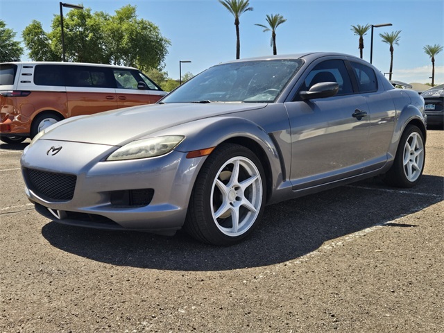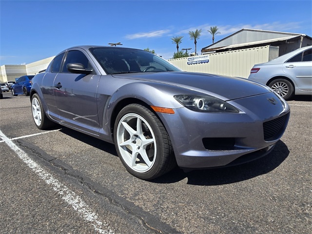Serving The Valley For Over 40 Years! This Mazda RX-8 is equipped with the following features: Rotary Accent Package, 16" x 7.5JJ Aluminum Alloy Wheels, 4-Wheel Disc Brakes, 6 Speakers, ABS brakes, Air Conditioning, Alloy wheels, AM/FM/CD Stereo w/6-Speakers, Bumpers: body-color, CD player, Cloth Trimmed Upholstery, Driver door bin, Driver vanity mirror, Dual front impact airbags, Dual front side impact airbags, Four wheel independent suspension, Front anti-roll bar, Front Bucket Seats, Front Center Armrest, Front reading lights, Illuminated entry, Leather Shift Knob, Leather steering wheel, Low tire pressure warning, Outside temperature display, Overhead airbag, Overhead console, Panic alarm, Passenger door bin, Passenger vanity mirror, Power door mirrors, Power steering, Power windows, Radio data system, Rear anti-roll bar, Rear seat center armrest, Rear window defroster, Reclining Front Bucket Seats, Remote keyless entry, Security system, Speed control, Speed-sensing steering, Sport steering wheel, Steering wheel mounted audio controls, Tachometer, Tilt steering wheel, and Variably intermittent wipers.
