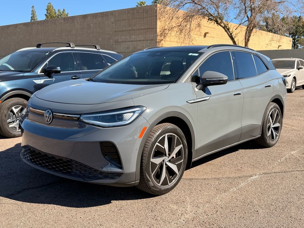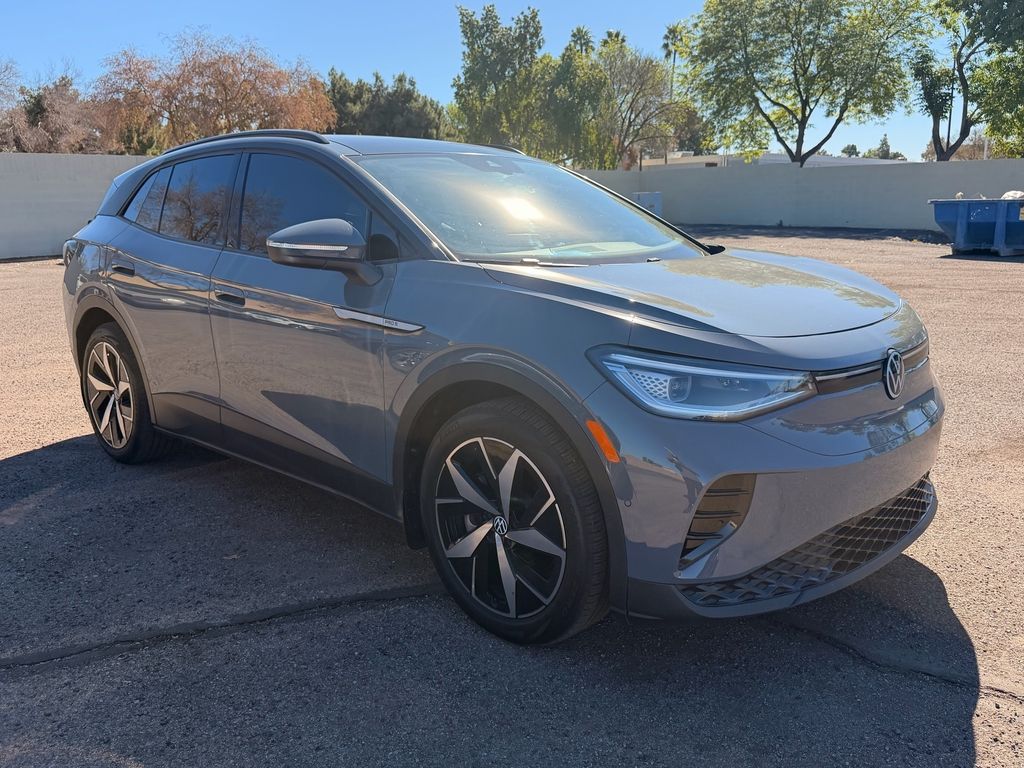 Serving The Valley For Over 40 Years! This Volkswagen ID.4 is equipped with the following features: 2-in-1 (240V/120V) EV Charging Cable, 4 Wheel Independent Suspension, 4.39 Axle Ratio, 7 Speakers, ABS brakes, Air Conditioning, Alloy wheels, Auto High-beam Headlights, Auto-dimming Rear-View mirror, Auto-Dimming Rearview Mirror w/HomeLink Connect, Automatic temperature control, Brake assist, Bumpers: body-color, Delay-off headlights, Driver door bin, Driver vanity mirror, Driver's Seat Mounted Armrest, Dual front impact airbags, Dual front side impact airbags, Electronic Stability Control, Emergency communication system: VW Car-Net Safe & Secure 5-year, Exterior Parking Camera Rear, First Aid Kit, Four wheel independent suspension, Front anti-roll bar, Front Bucket Seats, Front dual zone A/C, Front fog lights, Front reading lights, Fully automatic headlights, Heated door mirrors, Heated Front Seats, Heated front seats, Heated steering wheel, Heavy Duty Trunk Liner w/VW CarGo Blocks, Illuminated entry, Low tire pressure warning, Luggage Net, Memory seat, Navigation System, Occupant sensing airbag, Outside temperature display, Overhead airbag, Overhead console, Panic alarm, Passenger door bin, Passenger seat mounted armrest, Passenger vanity mirror, Perforated V-Tex Leatherette Seating Surfaces, Power door mirrors, Power driver seat, Power Liftgate, Power passenger seat, Power steering, Power windows, Radio data system, Radio: Discover Pro Max w/12" Touchscreen Nav, Rain sensing wipers, Rear anti-roll bar, Rear reading lights, Rear seat center armrest, Rear window defroster, Rear window wiper, Remote keyless entry, Rubber Mats Kit, Speed control, Speed-sensing steering, Split folding rear seat, Spoiler, Steering wheel mounted audio controls, Telescoping steering wheel, Tilt steering wheel, Traction control, Trip computer, Turn signal indicator mirrors, Variably intermittent wipers, VW Car-Net Safe & Secure 5-Year Plan, and Wheels: 20" 5-Spoke 2-Tone Machined Alloy.