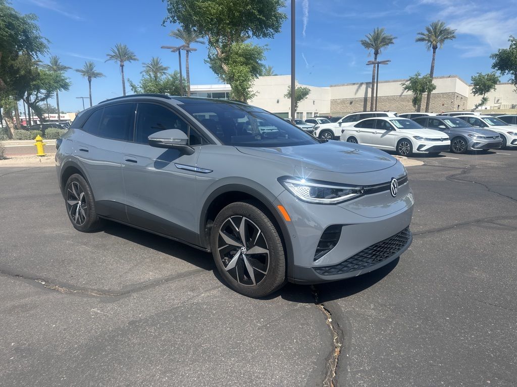 Serving The Valley For Over 40 Years! This Volkswagen ID.4 is equipped with the following features: 3.90 Axle Ratio, 4 Wheel Independent Suspension, 7 Speakers, ABS brakes, Air Conditioning, Alloy wheels, Auto High-beam Headlights, Auto-dimming Rear-View mirror, Automatic temperature control, Brake assist, Bumpers: body-color, Delay-off headlights, Driver door bin, Driver vanity mirror, Driver's Seat Mounted Armrest, Dual front impact airbags, Dual front side impact airbags, Electronic Stability Control, Emergency communication system: VW Car-Net Safe & Secure 5-year, Exterior Parking Camera Rear, Four wheel independent suspension, Front anti-roll bar, Front Bucket Seats, Front dual zone A/C, Front fog lights, Front reading lights, Fully automatic headlights, Heated door mirrors, Heated Front Seats, Heated front seats, Heated steering wheel, Illuminated entry, Low tire pressure warning, Memory seat, Navigation System, Occupant sensing airbag, Outside temperature display, Overhead airbag, Overhead console, Panic alarm, Passenger door bin, Passenger seat mounted armrest, Passenger vanity mirror, Perforated V-Tex Leatherette Seating Surfaces, Power door mirrors, Power driver seat, Power Liftgate, Power passenger seat, Power steering, Power windows, Radio data system, Radio: Discover Pro Max w/12" Touchscreen Nav, Rain sensing wipers, Rear anti-roll bar, Rear reading lights, Rear seat center armrest, Rear window defroster, Rear window wiper, Remote keyless entry, Speed control, Speed-sensing steering, Split folding rear seat, Spoiler, Steering wheel mounted audio controls, Telescoping steering wheel, Tilt steering wheel, Traction control, Trip computer, Turn signal indicator mirrors, Variably intermittent wipers, and Wheels: 20" 5-Spoke 2-Tone Machined Alloy.